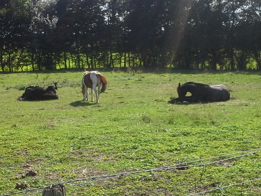 Le plus étonnant est qu'hier je baladais ma jument (la mère) et on passe près du pré. Cela fait à peine un peu plus d'un mois qu'elle est sevrée. Des personnes étaient entrées dans le "chemin" lui-même clôturé qui sépare le chemin de campagne des prairies donc je devais y aller pour lui dire que c'était privé, surtout que ma pouliche dormait affalée près de la clôture et qu'ils essaient qu'elle se lève pour pouvoir la caresser en émettant des cris et agitant des carottes mais aussi bâtons ... J'ai cru que j'allais me retrouver avec jument et pouliche folles ou à hennir ou que sais-je ... elles ne s'étaient plus vues évidemment depuis le mois passé.