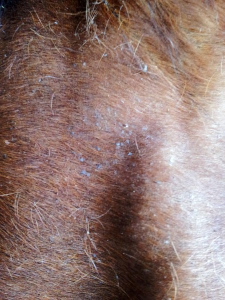 Mon cheval est vermifugé en phyto+homéo (résultat copro Fevrier 2014: négatif), il est nourrit depuis Mars 2014 au St hippolyt (equiguard+luzerne mix) et il a foin à volonté.