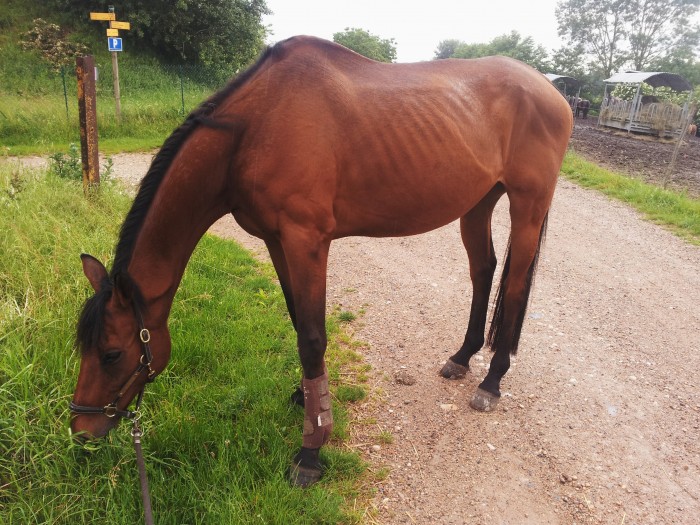 Je l'ai récupérer depuis 2 ans et je cherche désespérément les causes de son mal-être. Il a donc été placé en pension box+paddock après avoir vécu 3 ans de club en box (où il était très bien soigné). Il a repris un peu d'état mais toujours "maigre".