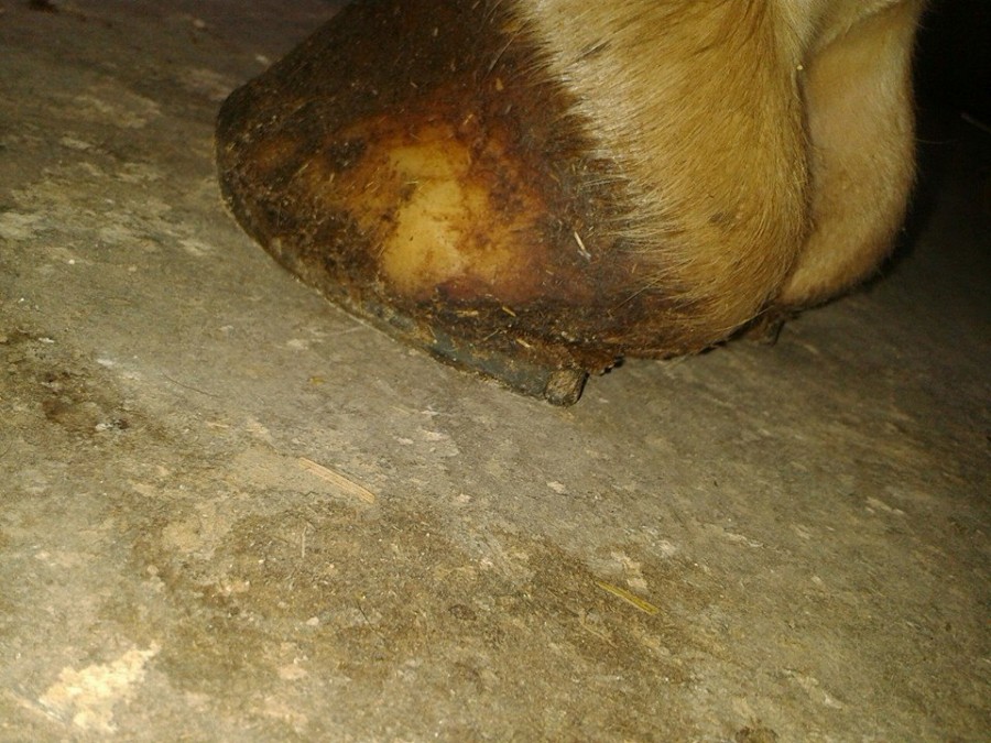 beaucoup d'évasement au niveau des talons, fort "rétrécissement" au niveau des quartiers avant un "redéploiement" en mamelles et en pince. Et ce, à chaque postérieur, avec un excès plus marqué sur le droit (sur lequel elle a le plus de mal à prendre appui). Il faudrait que je fasse des photos demain si j'ai le temps.