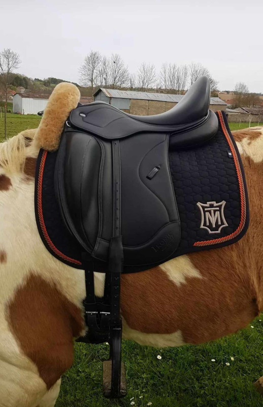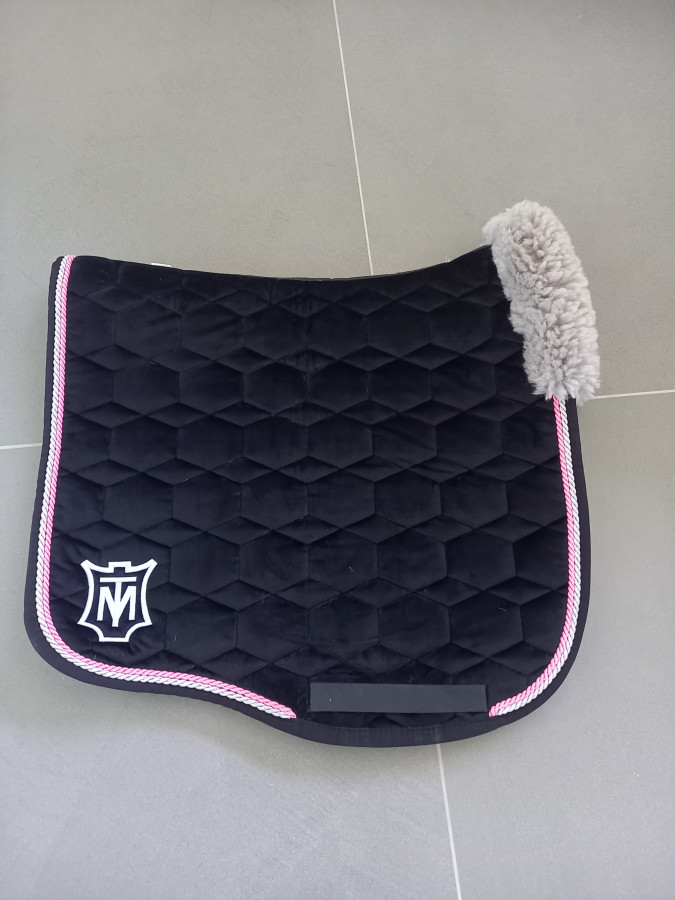 Vends tapis Mattes dressage mouton juste sur le devant pas en dessous, velours noir, état quasi neuf. Valeur 85 euros, vendu 65.