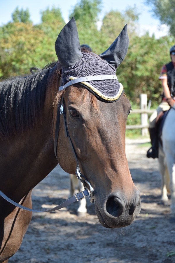 J'ai trouvé la bonne combinaison pour le tapis que je veux me faire faire, qui sera réservé aux concours, mais mon cheval est du genre "port du bonnet obligatoire en cas de pluie, de vent et d'insectes", donc tant qu'à faire, prendre le bonnet assorti.