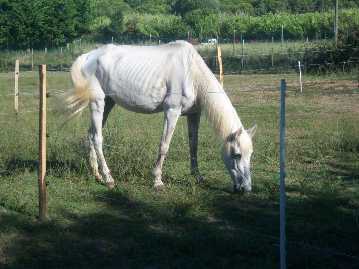 Il y a quelques jours (le 31.08.14), mon amie et moi tombons par hasard sur une annonce sur Facebook pour un appel a la solidarité pour sauver Sarha, qui est dans un triste état... Nous réfléchissons un peu puis nous nous décidons à la prendre chez nous, nous avons du terrain et d'autres chevaux.