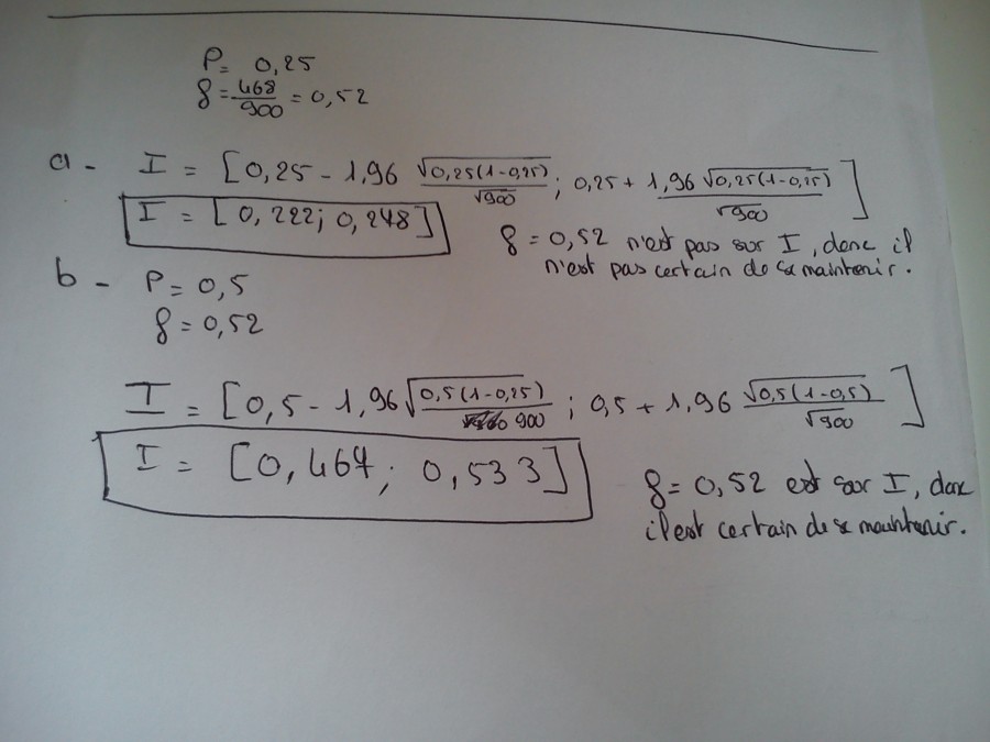 Je suis juste capable de répondre aux questions (enfin j'espère) comme "calculer l'intervalle de confiance de la proportion de votants pour ce candidat" (extrait de ma feuille d'exercices) et ensuite calculer f pour avoir la fréquence puis faire f-1/racine carré de n et f+1/racine carré de n pour avoir l'intervalle mais il y a des questions du style :