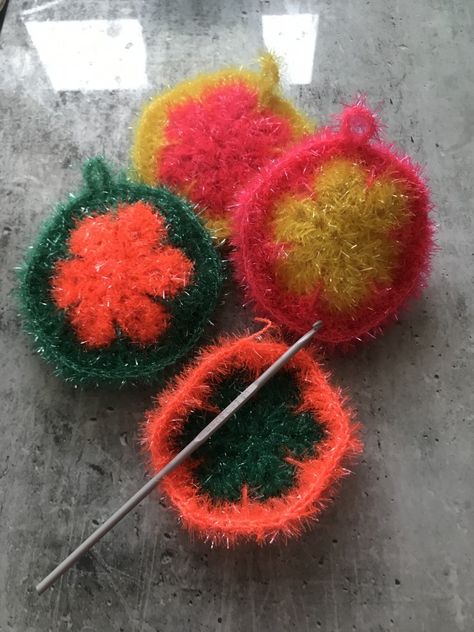 J'ai tricoté les mêmes (en forme de fruits) en début d'année, avec la laine spéciale "éponge".