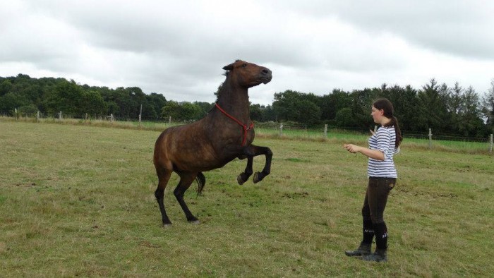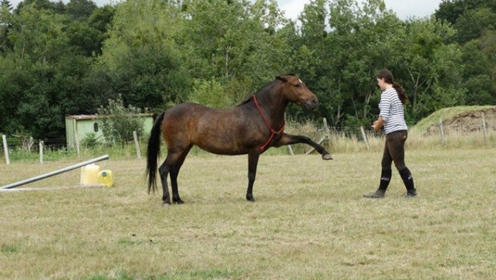 Donc tu prend le pied et tu tend la longe pour que le cheval regarde a droit et que donc son poids se met sur le coter que tu tien. Il vas essayer de bouger, tourner en rond comme naturellement ( cela je laisse faire), retiré son pieds ,.... Mais y allez doucement sa dépend le cheval. Au départ juste le fait qu'il pose son genou a terre tu peut récompenser si c'est "dur" pour lui déjà. Puis petit a petit il poseras son genou ( que tu tien hien) puis le deuxième et se retrouveras donc a genou. Ange lui n'est pas passer par cette phase. Il a poser les genoux et s'est coucher directe. Mais si le genou est déjà "dur" a obtenir reste dessus avec beaucoup de récompense. Grattouille, carotte, sa dépend tes récompense que tu donne.