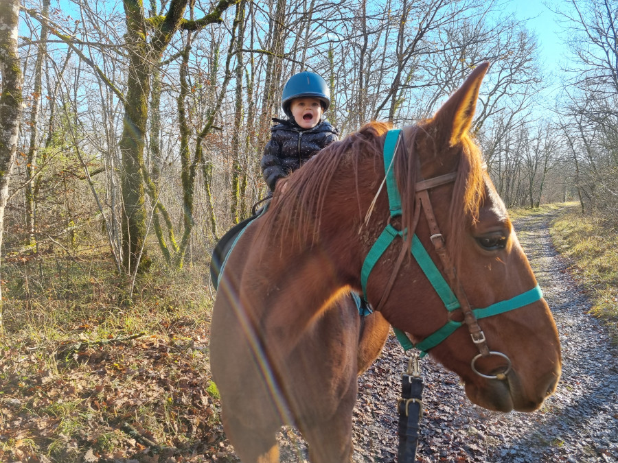 Velours se porte bien et ne travaille pas ou peu faute de temps, mais il se plie avec grâce à sa nouvelle discipline le baby poney, avec notre fille qui se tient maintenant en selle. Faut juste guetter les branches basses forcément avec ce poney d'1m60.