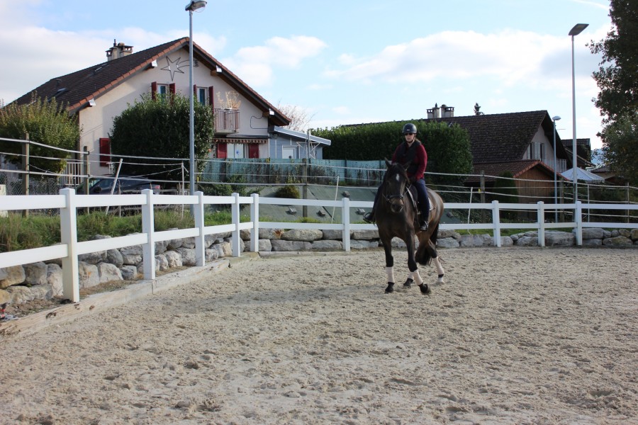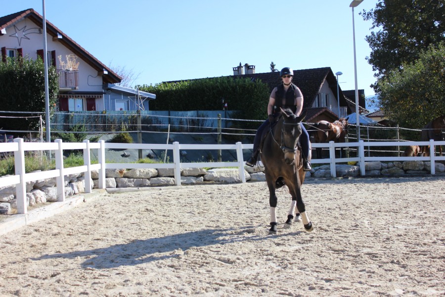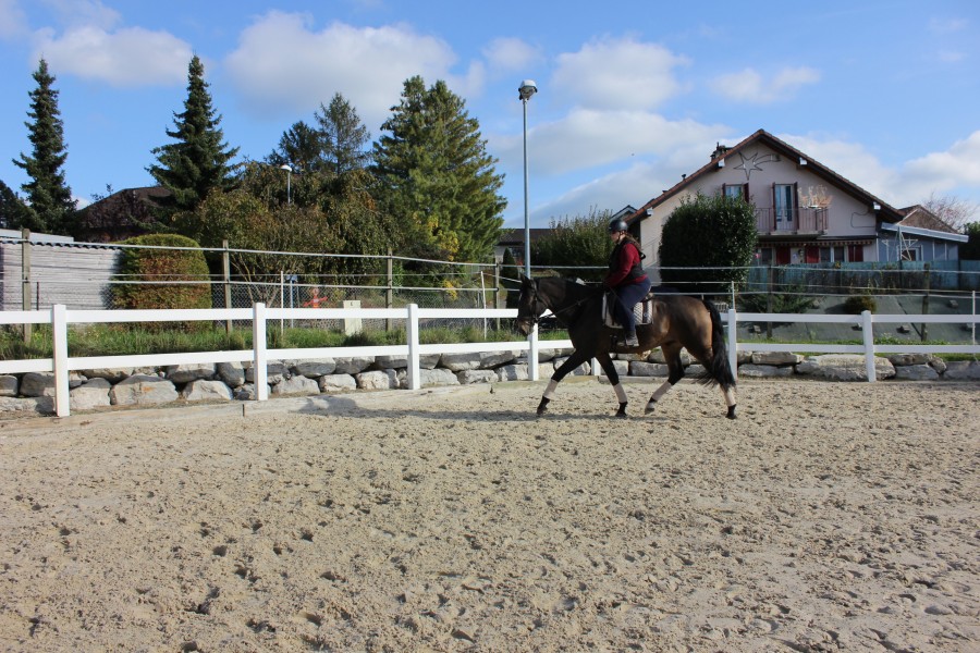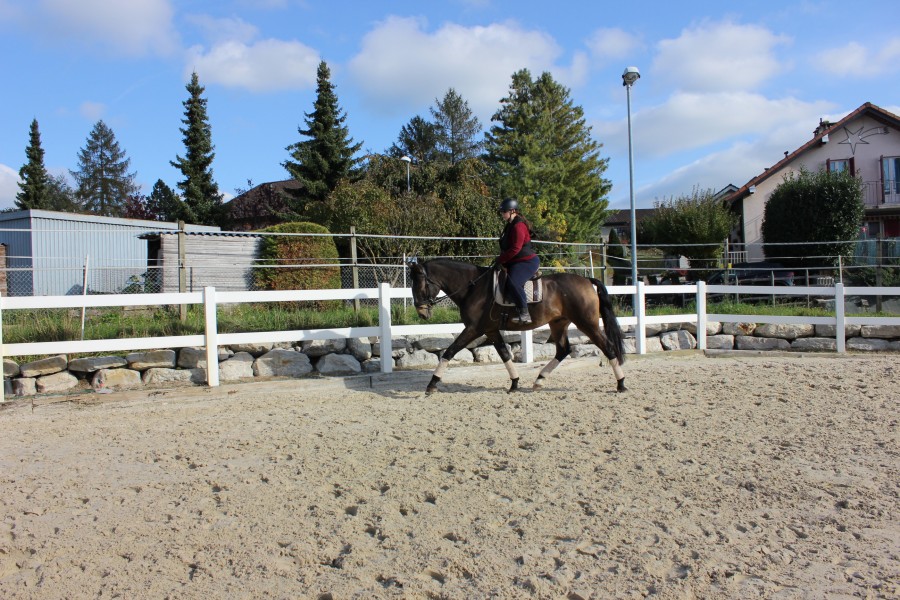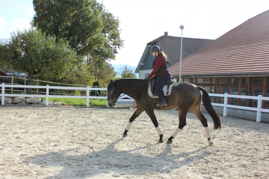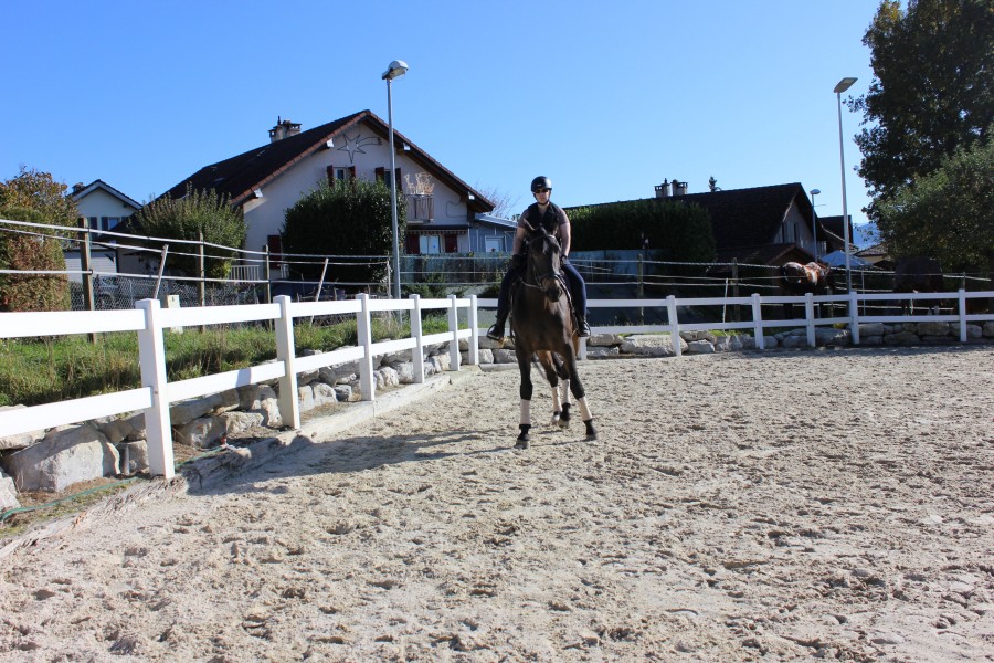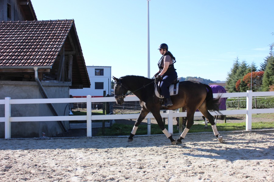 Même séance que hier mais avec un trou plus long aux étriers et mes premières foulées de trot assis. Pas facile pour moi et pour lui XD ça remue là-haut !
