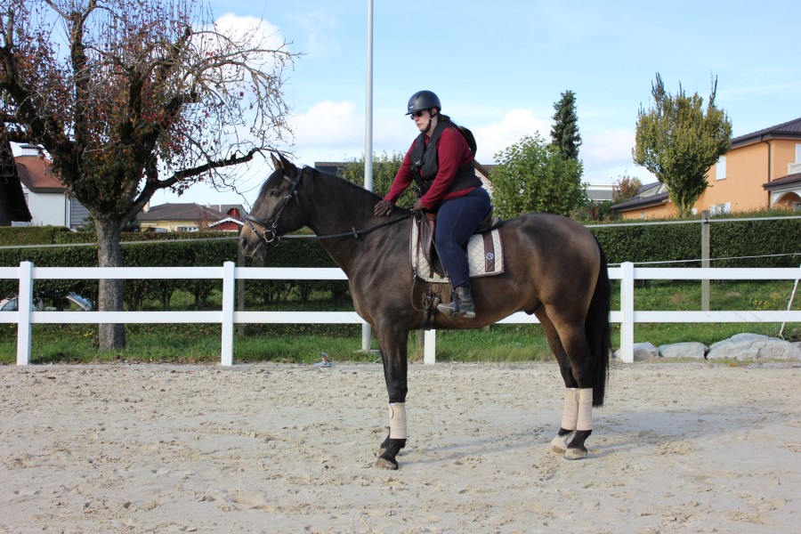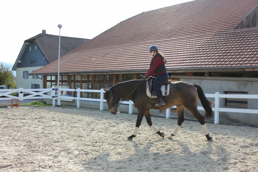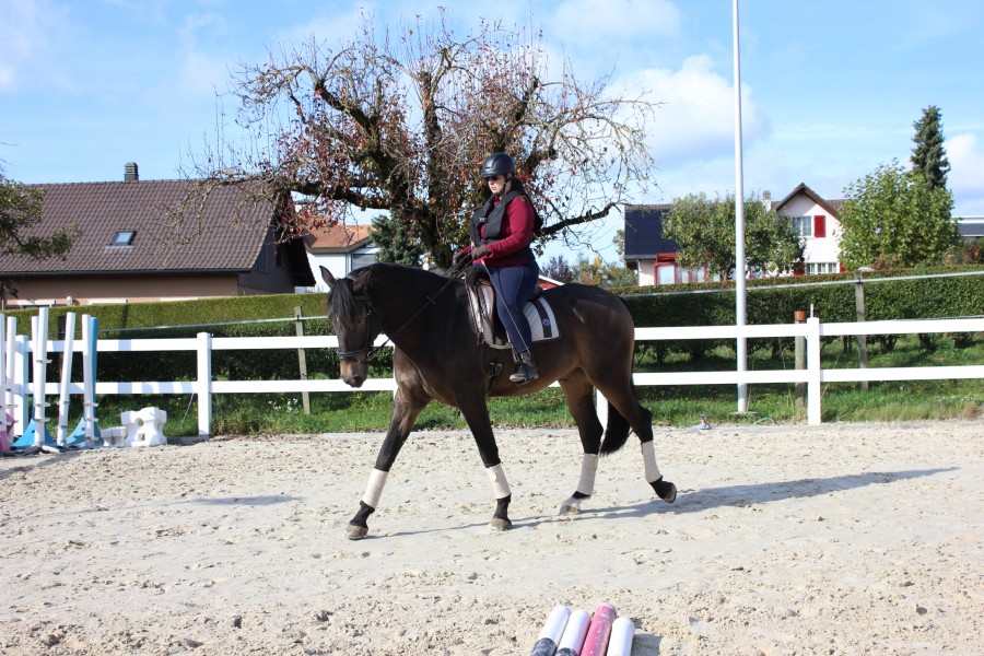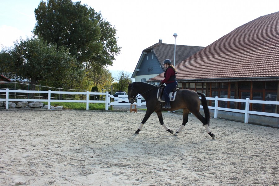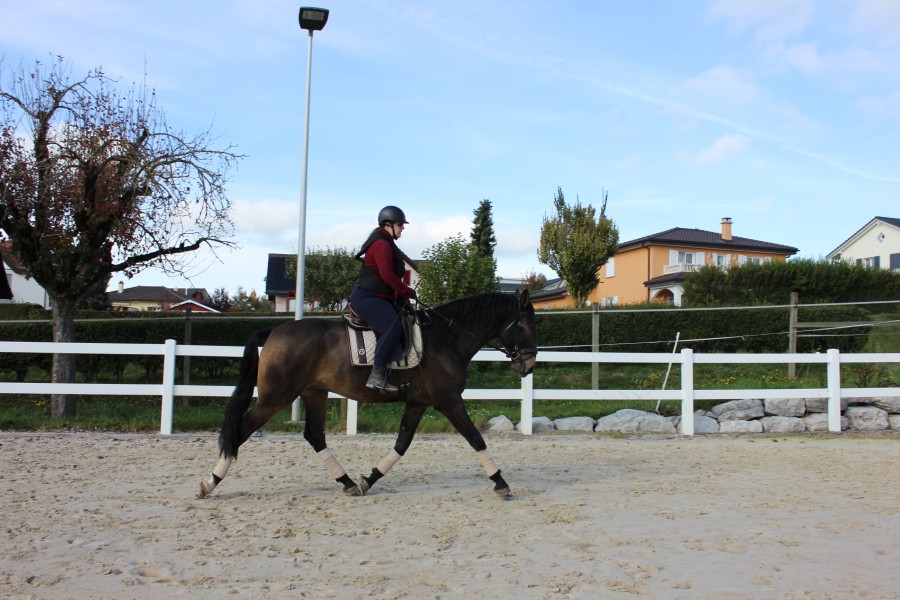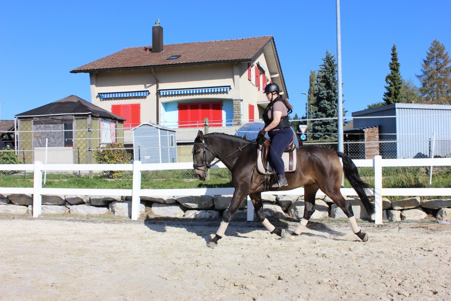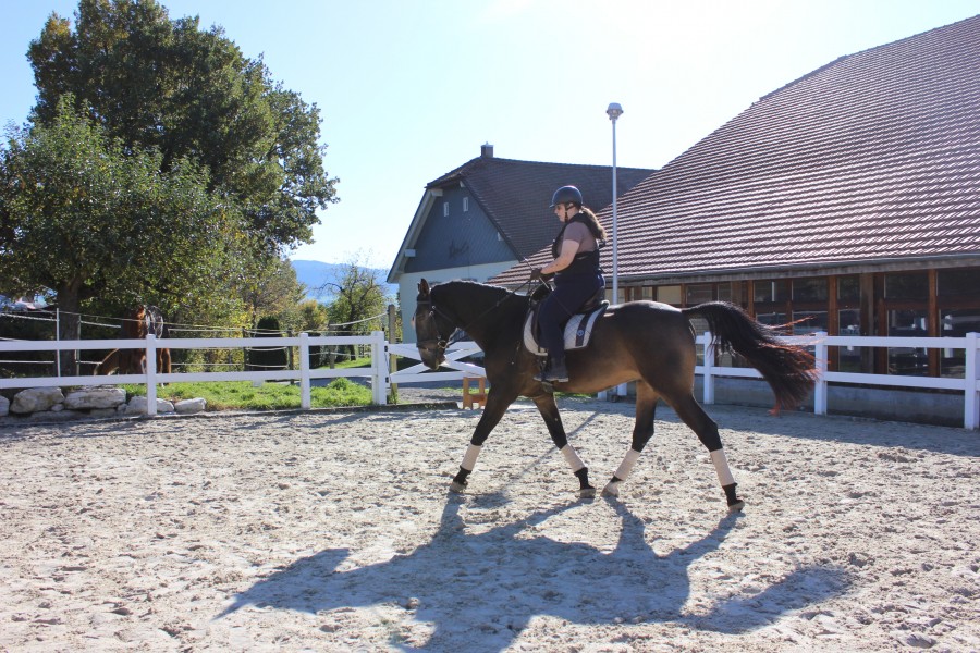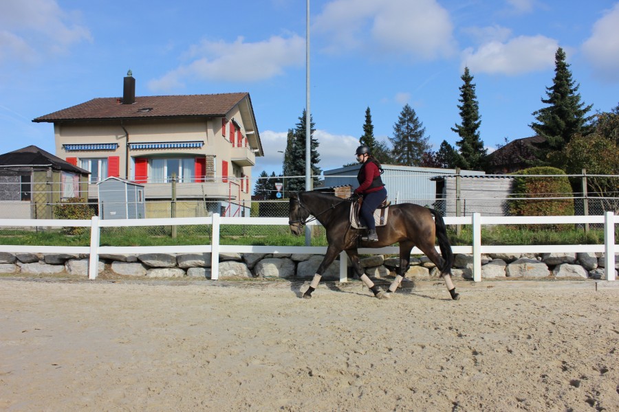 Même séance que hier mais avec un trou plus long aux étriers et mes premières foulées de trot assis. Pas facile pour moi et pour lui XD ça remue là-haut !