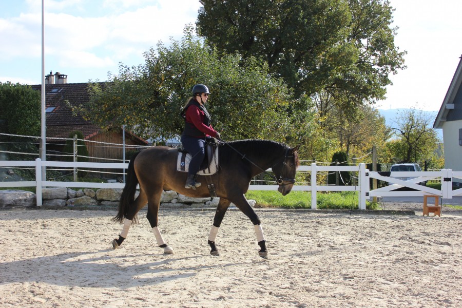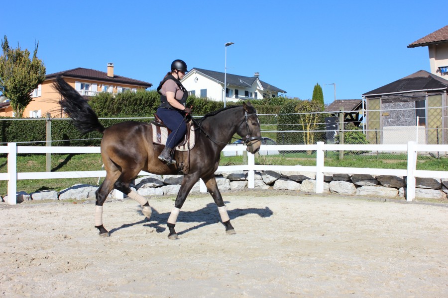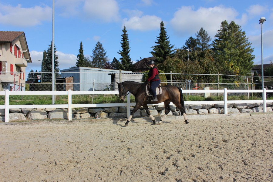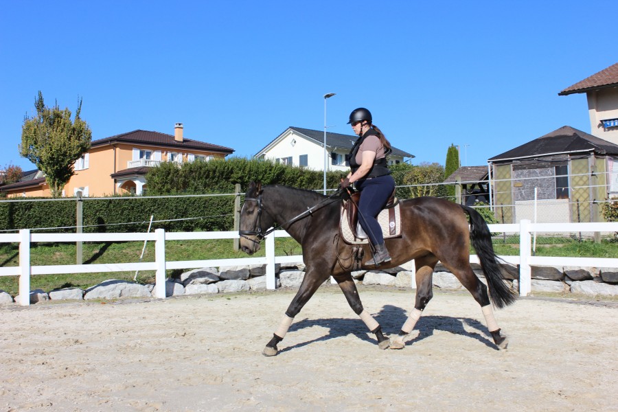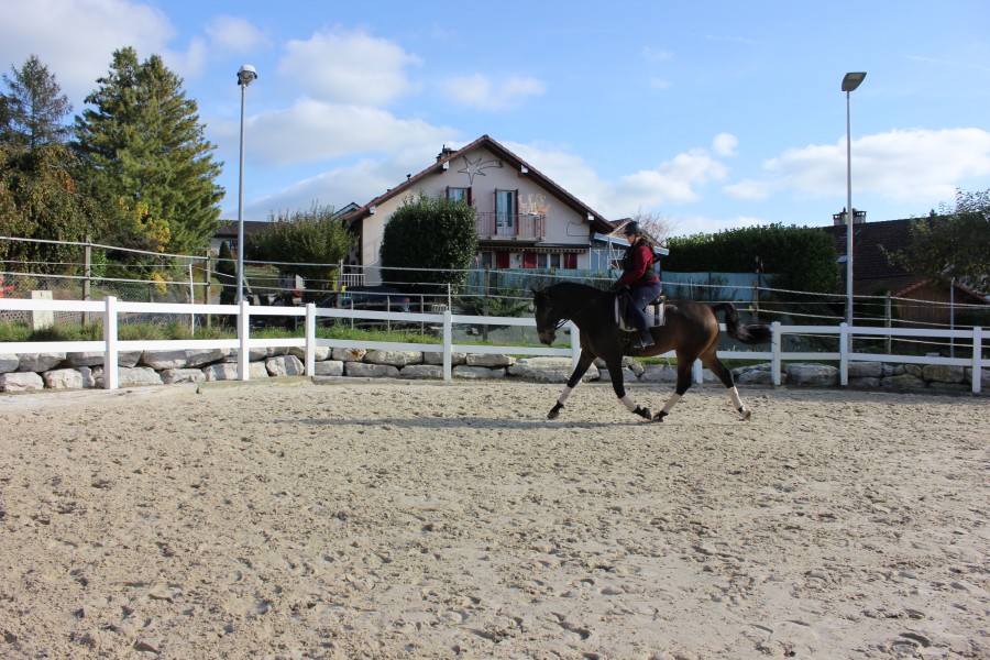 Au trot ! J'ai osé demandé plus d'énergie. Du coup plus d'engagement, plus tendu dans ses rênes, … bref, top ! Plusieurs fois je l'ai senti prêt à prendre le galop, mais j'ai pas donné le départ, je referais en longe.