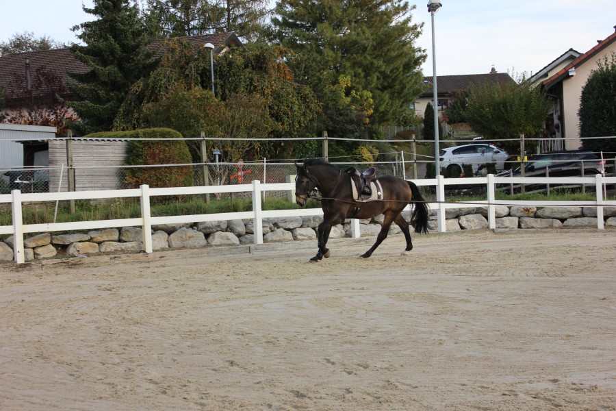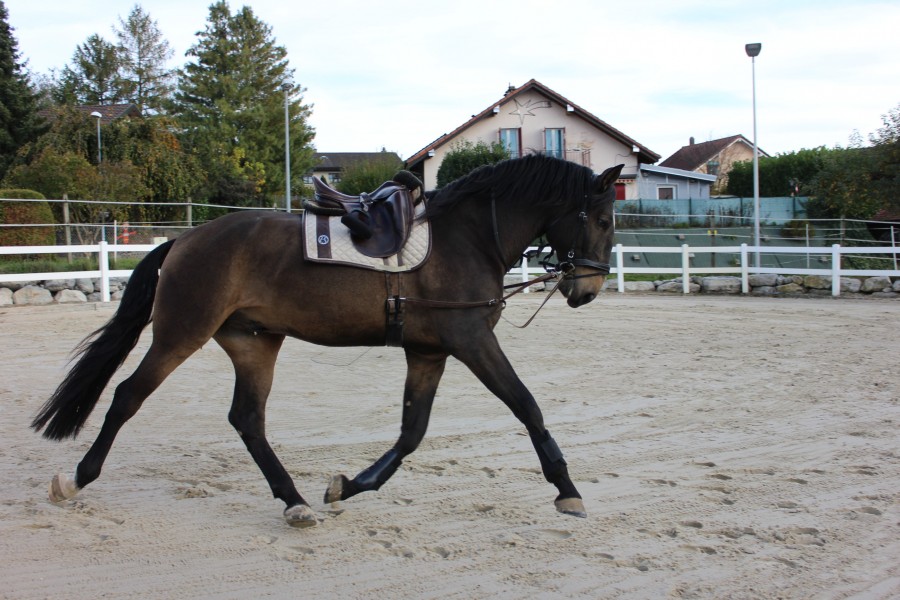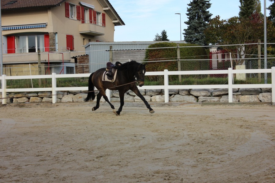 Petite longe pour commencer où il part en dos rond au galop…. hum. Me suis dit que si il était trop concon je le longerai uniquement. Il faut dire qu'il y avait le souffleur de feuille autour du carré…