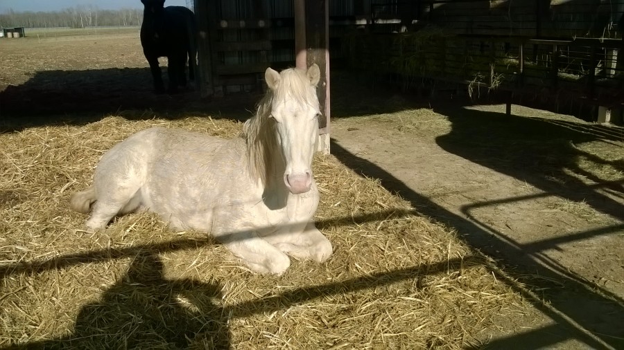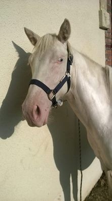 Dakota est débourrée depuis le mois de juin. Nous avons découvert qu'elle était sourde et voyait pas très bien de l'oeil gauche. Cela serait dû au SLPASHED WHITE.