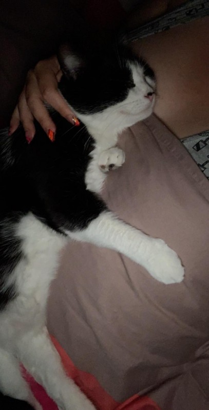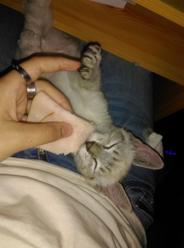 Ma soeur l'a trouvé sous une voiture à 4h du matin il y a trois jours, elle a passé une demi-heure à faire "miaou miaou" pour qu'il sorte. C'est un petit mec de 3 mois, avec la queue cassé et qui est très mince (ça se voit pas car il a un poil épais mais on sent ses os).