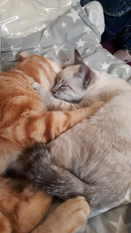 Pour le coup ça lui va bien, il fait des bruits bizarres quand il joue (j'ai l'impression d'avoir un Gremlin à la maison parfois lol) et il est très énergique. Nirvana l'accepte bien, il dort avec et lui fait la toilette de temps à autres. Nelick est plus réservé mais c'est le plus méfiant des deux donc ce n'est pas très étonnant.