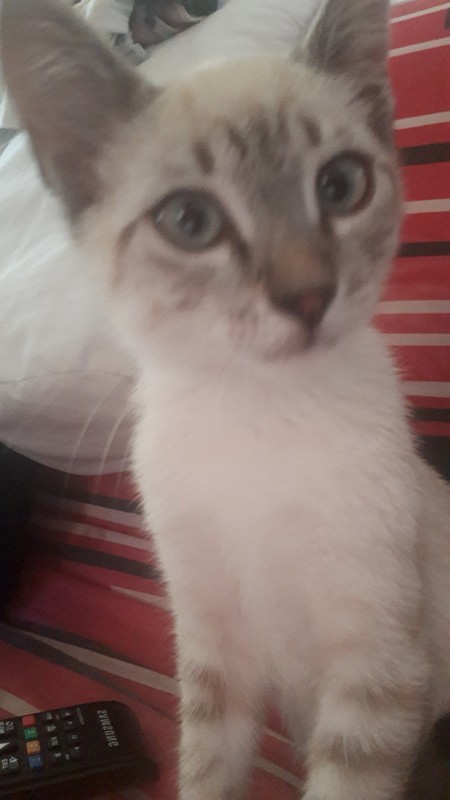 Pearl est un siamois apparemment, et un Seal Tabby Chocolate de par les recherches que j'ai pu faire. J'aurais tendance à le qualifier d'American de par sa stature plus que filiforme et ses grandes oreilles, mais peut-être qu'il changera une fois adulte donc bon. Il louche très souvent, pas tout le temps comme la plupart des Siamois que j'ai croisé mais environ 80% du temps.
