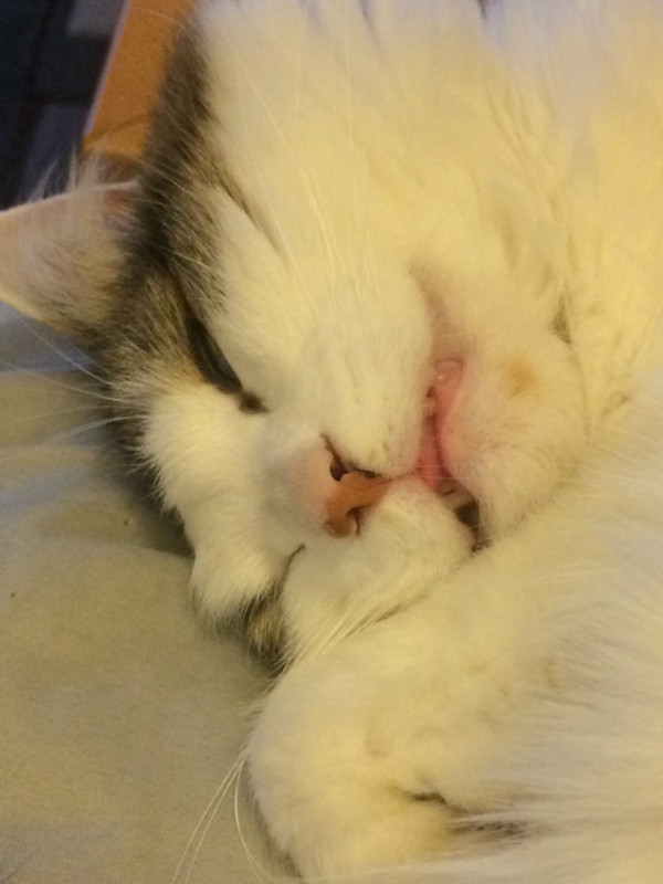 Je vais bien surveiller, pour l'instant elle est en forme, plus de vomis, elle mange normalement, dort beaucoup (comme d'hab) et se colle à moi pour se réchauffer