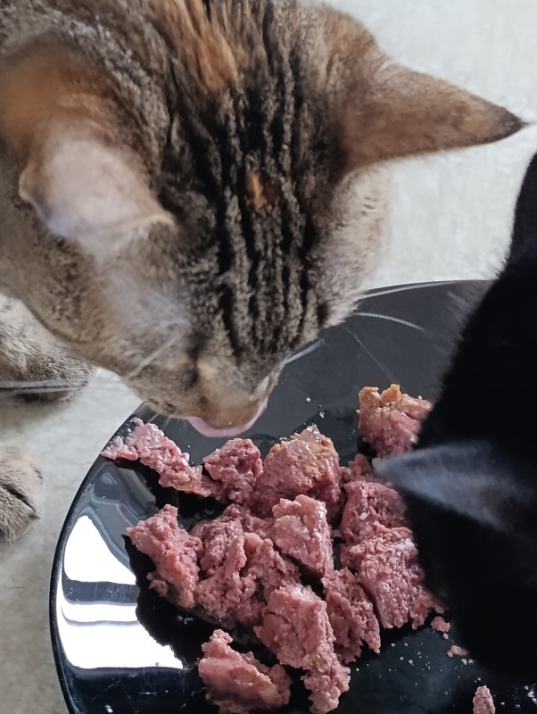 Là, depuis vendredi, elle est en stress complet à cause de la collerette, elle se cogne partout, donc se stresse. Elle se planque, elle galère de fou à manger et à boire avec sa collerette. Là je l'ai aidé tout à l'heure, elle était assoiffée et affamée. Mais je ne suis même pas certaine qu'elle ait réussi à manger suffisamment.