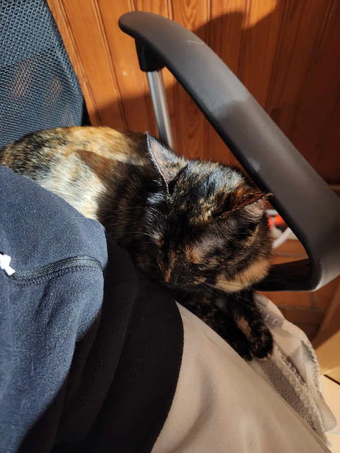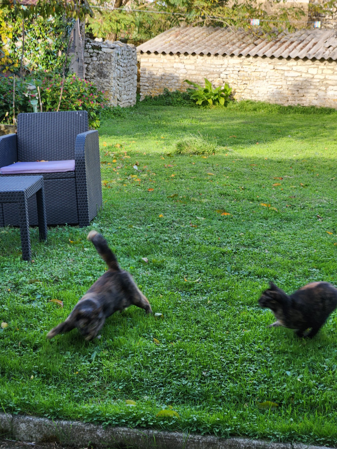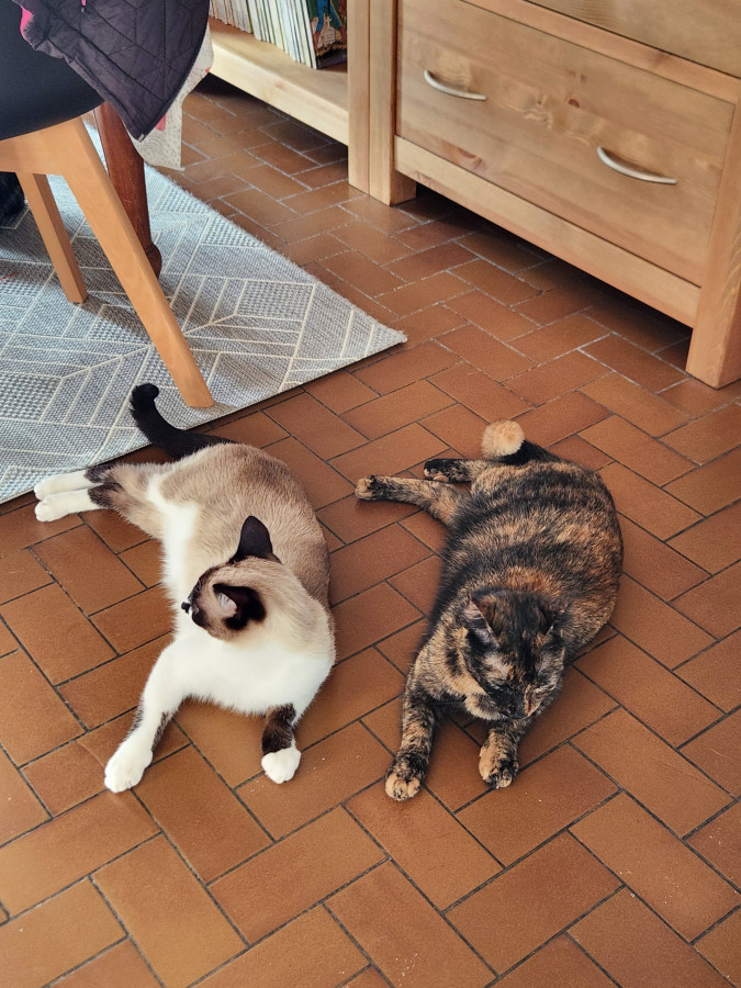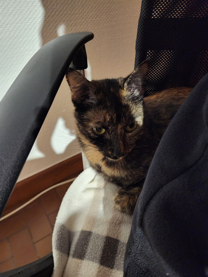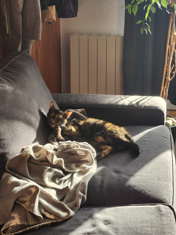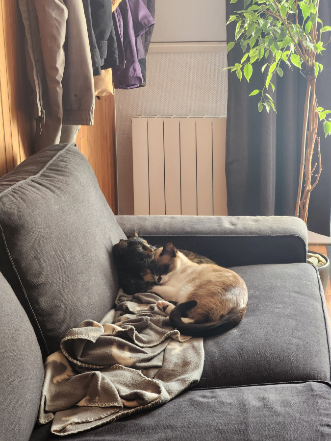 Édit : oh et là, en ce moment, j'ai Vitis et Lisaya de chaque côté de mes jambes sur la chaise, Yökli est venu voir s'il restait une place mais non et il est parti s'enrouler/se cacher dans le plaid sur le canapé genre je boude, trop drôle