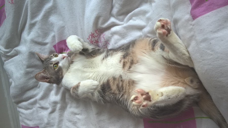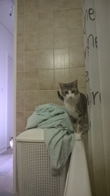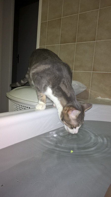 il miaulait depuis 10 min parce que ca faisait trois plombe que j'étais dans mon bain : Il monte sur le rebord, me regarde, miaule, descend, me regarde, miaule, remonte, me tape l'épaule, miaule, redescend etc
