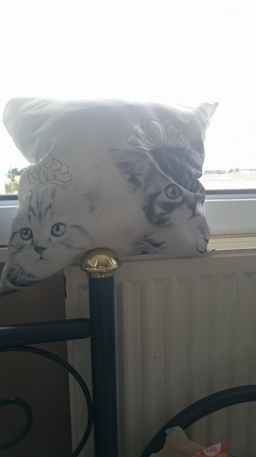 J'ai lavé son oreiller. Il était aussi blanc que lui. Donc je le mets à sécher sur le radiateur et là... Gros dos, queue bombée, maman j'ai peur ! Ça fait 10 minutes qu'il tente une approche. Si il fait tomber l'oreiller, je crois qu'il me fera une crise cardiaque...