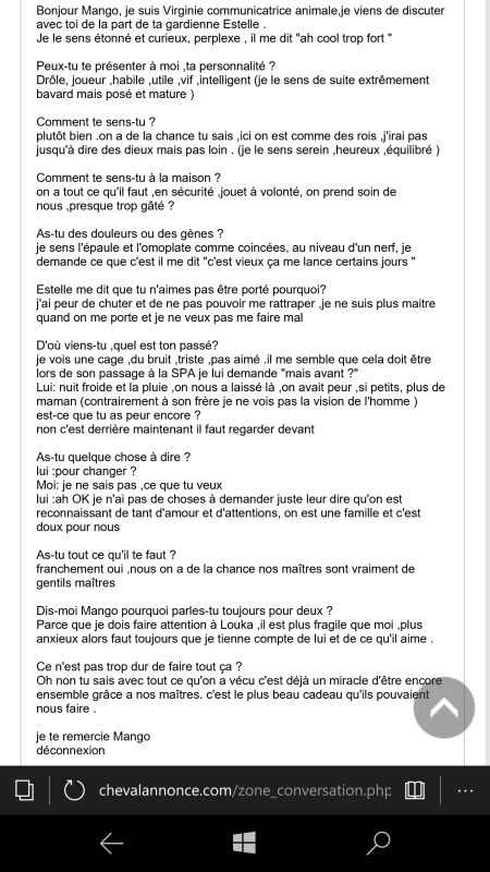 "Bonjour Louka je suis Virginie communicatrice animale, je viens pour discuter avec toi de la part de Estelle. (silencieux)