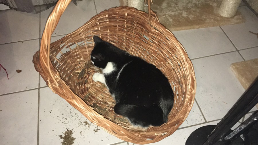 Là elle va bien. Elle tourne en rond pour aller dehors mais avec ce froid je veux pas la laisser trop longtemps... Elle a fait pipi et tout, donc elle attendra demain. Elle a son panier dans le salon (sous le radiateur évidement) et elle décide de là où elle dort...