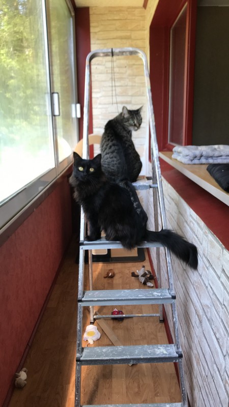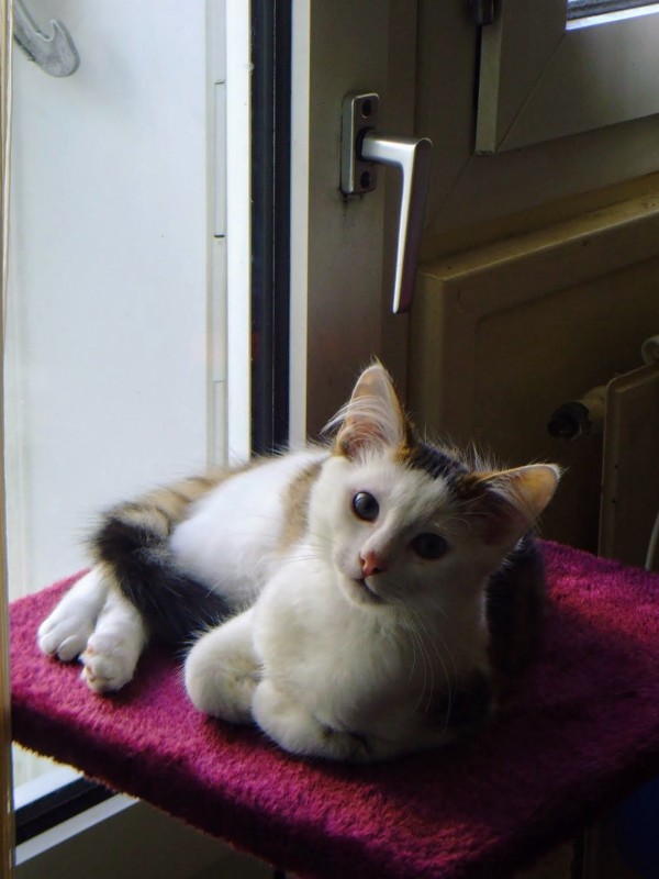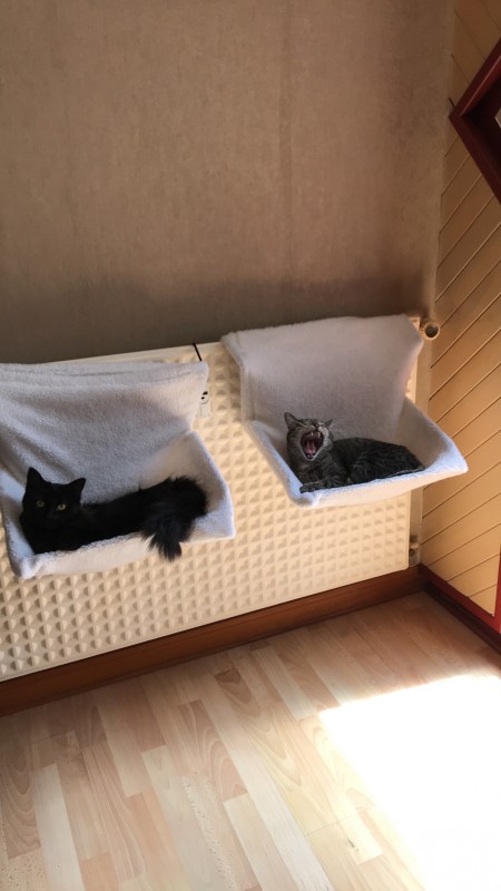 De retour à la maison je l’installe dans ma chambre, eau et litière (croquettes autorisées que le lendemain matin) et je la laisse tranquille une heure. Puis je la libère et j’installe un plaid sous mon lit pour qu’elle puisse se coucher sans avoir à grimper sur le lit.