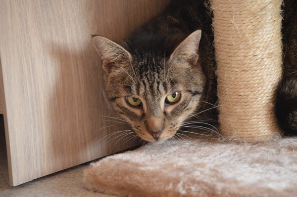 Le reste du temps, il est caché sous le bureau. Je lui ai mis une vieille blouse épaisse pour son confort. Il est loin d'être prêt à tolérer ma présence, il surveille tous mes mouvements. Mais ça viendra.
