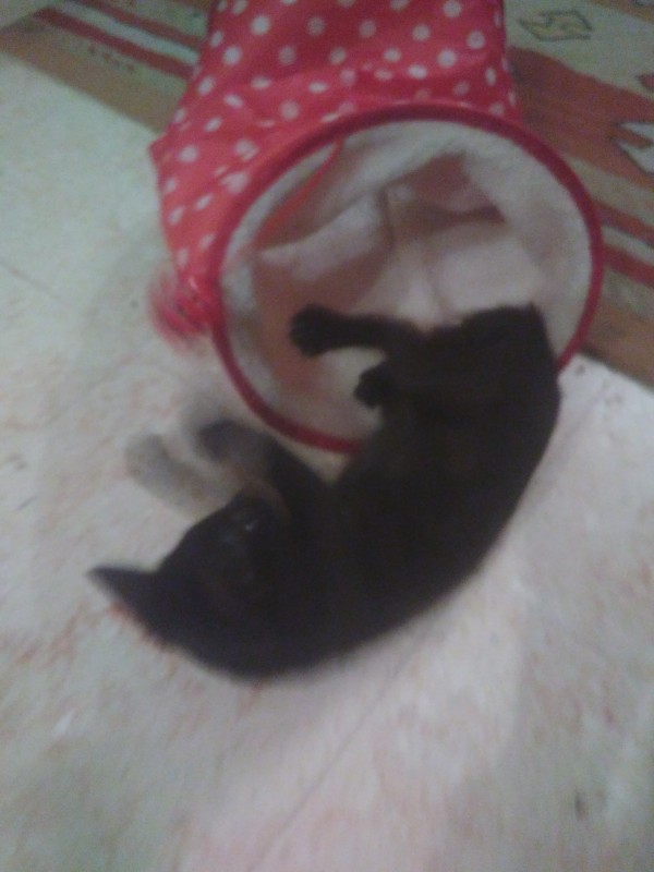 C'est un sacré !!! Il a miaulé tout le temps où je l'ai eu en caisse de transport, je pense qu'il ne connaissait pas du tout. Du coup en voiture, je l'ai sorti pour le garder sur moi. C'est un aventurier, un tout petit peu craintif sur certains bruits mais sinon il va partout, a exploré la maison tel Dartagnan en trottinant, il a trouvé très amusant les petites baballes qui font du bruit. Il s'est posé un petit peu et depuis que je lui ai fait découvrir le mini-tunnel en moumoute, il est complètement frappadingue ! Il nous fait mourir de rire, il se jette dedans façon ventre-y-glisse pour aller titiller la balle qui y est accrochée