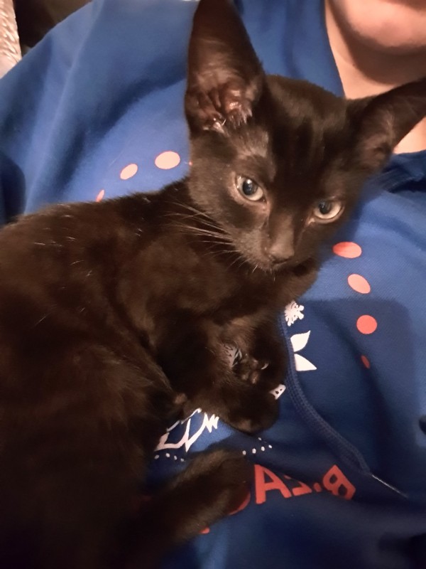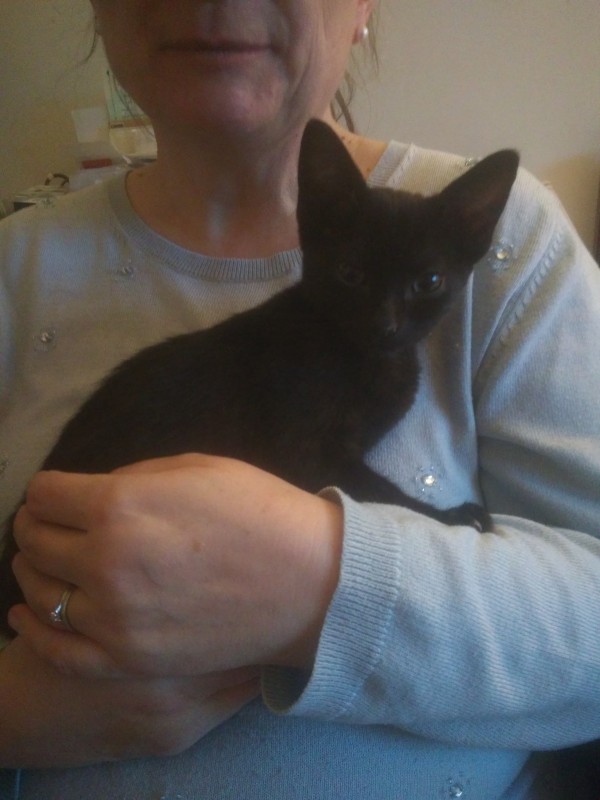 On a été voir la bête ! Qui nous a semblé infiniment plus petit que sur les photos ! Un tout petit chat noir dont les oreilles font moins grandes en réalité que sur photos ^^ Il doit avoir 2 mois grand max je dirais. Un petit tour chez le véto s'imposera rapidement pour checker tout ça. Parce que oui évidemment, on est repartis avec !