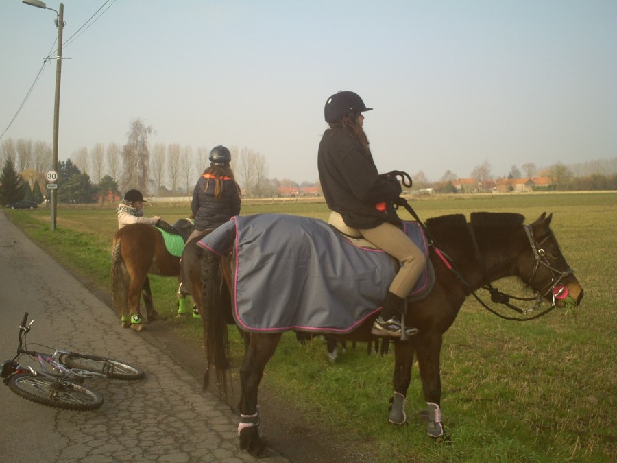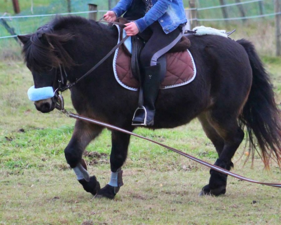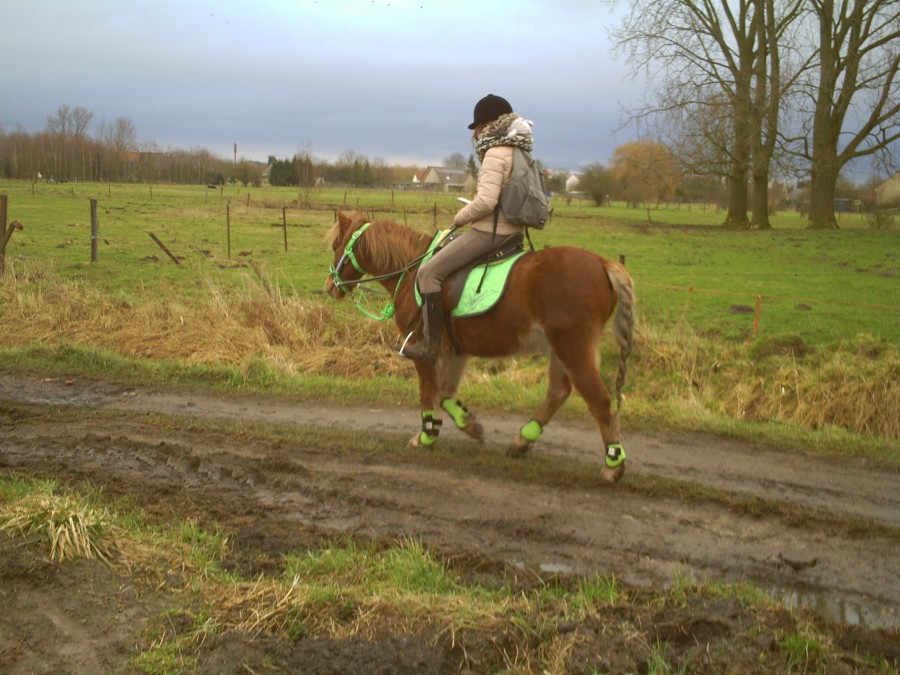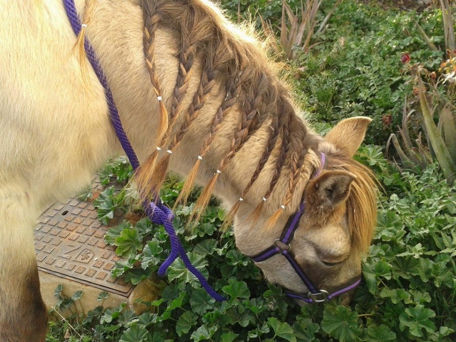 Il a les crins mi long, et je l'ai en passant les crins par en dessous en croisant, ça tient mieux. (et faut pas mettre de démélant avant)
