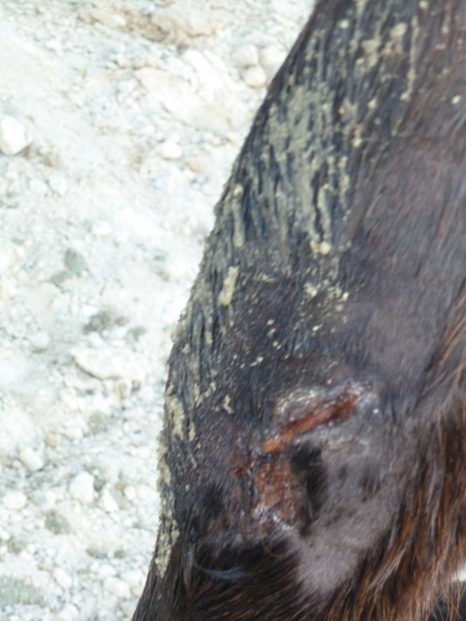 Elle m'a donné son GO pour le monter. Alors , je lui ai mis la selle et puis,Il a reçu un coup de sabot dans le genou au pré...plaie ouverte , véto , soins tous les jours+miel pour aider à la cicatrisation...mais normalement plus de peur que de mal...