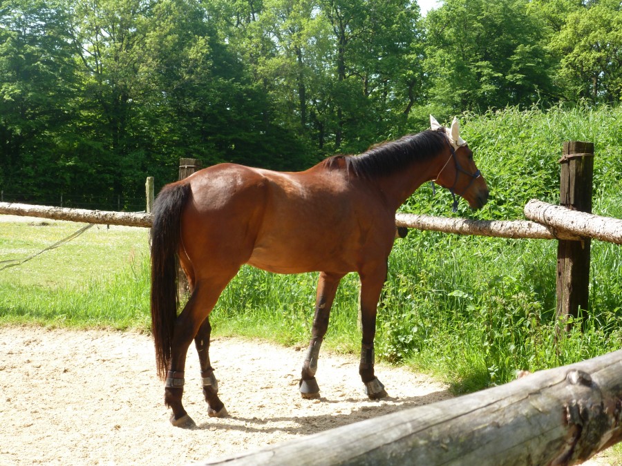 La blessure au genou de Veinard rétablie, j'ai enfin posé mes fesses dessus...1ère fois , il était très tendu et moi aussi ...heureusement , on me le tenait...et hier, nous avons pris notre premier cours...pas mal à la longe(pas, trot) puis monté ...quelques figures simples au pas avec contact sur le mors ...Monsieur calme sauf que je n'arrive pas à le garder arrêter 6 secondes...