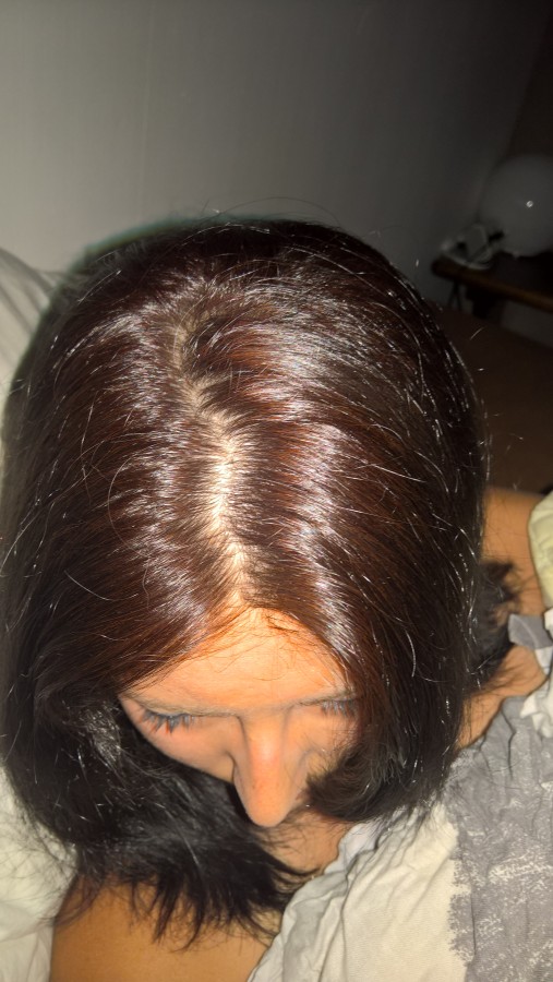Je perd beaucoup mes cheveux, même si ils sont épais je le sens. J'ai eu quelques cheveux blancs dans le lot, à cette heure, tombés. De manière générale, mes cheveux s'éclaircissent, je suis passée d'un brun auburn naturel à un châtain foncé. Comble, je commence à avoir des pellicules.