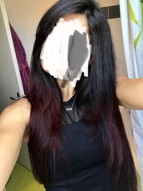 Je suis brune très foncé de base, j'avais réussi à avoir de beaux reflets rouge/auburne, mais j'ai ensuite eu la très mauvais idée de faire un tye and dye (je n'ai pas pu résisté à l'effet de mode ) une bonne partie de mes longueurs à été décolorée et à tourné au roux biiiiien prononcé