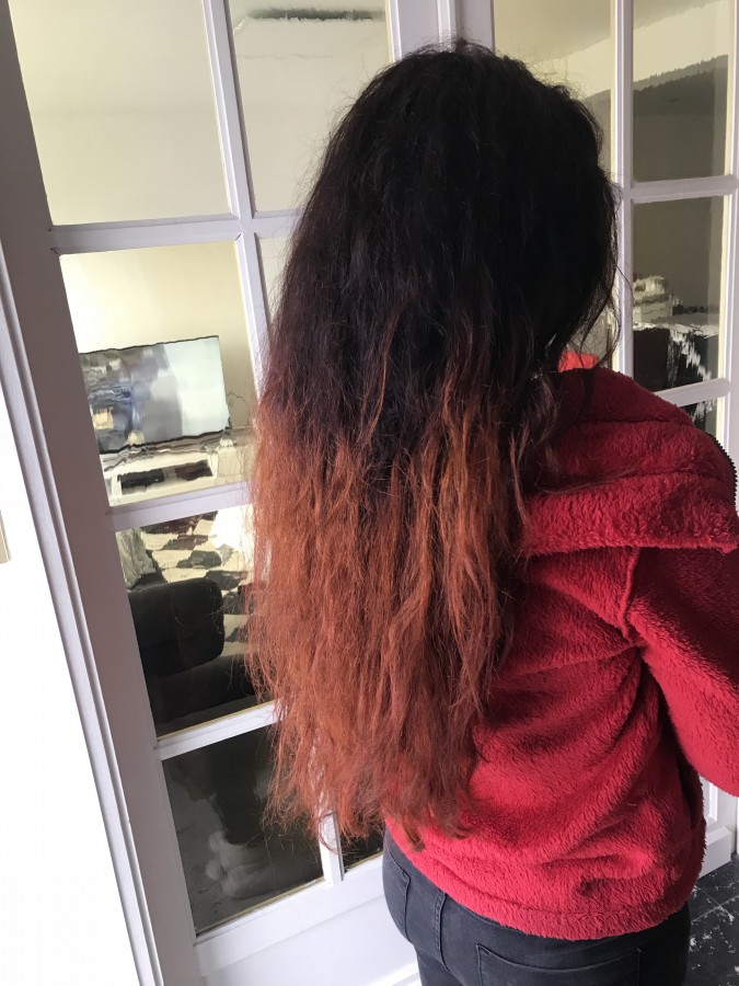 Sur la deuxième, je venais juste de faire une décoloration chez le coiffeur, et qui bien sûr à fait apparaître un cheveux bien bien roux suite à tous les hennés effectués, et mes cheveux étaient bien bien sec en plus de ça .