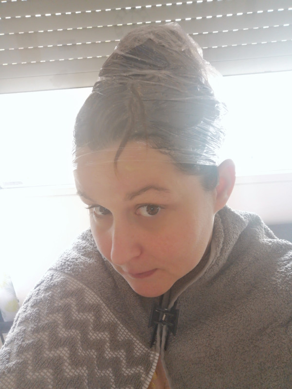 Ça fait un moment que je n'avais pas fait de masques aux poudres. Toujours dans l'optique d'apaiser mon cuir chevelu j'ai fait un masque avec de la poudre de pivoine + tulsi + ortie + rhassoul avec de la compote, de l'aloe vera et des HE (arbre à thé, geranium, lavande). Sur les pointes j'ai mis l'huile de soin vendue sur aroma zone (ricin, coco, amla, avocat, olive, brocoli, jojoba et moutarde).