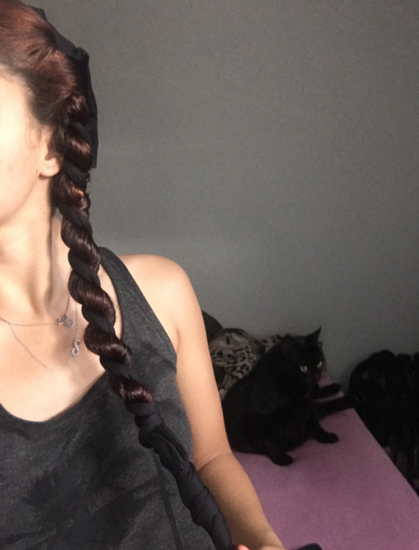 Je fais moi aussi un test ce soir avec une paire de collant enroulé autour de mes cheveux. Une astuce que j’ai trouver sur YouTube afin d’avoir des boucles plus définies.