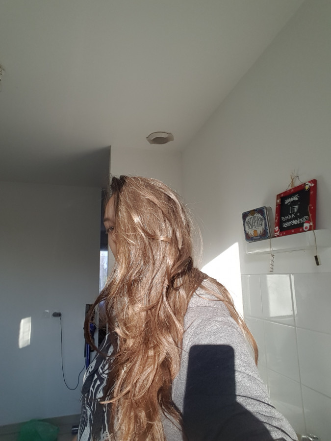 Bon a la fin avec en plus le frottement de mes vêtements (parce que mon vilain homme et son ami m'ont perdu mes élastiques en jouant avec), le niveau de soins proche du néant et le fait que je démêlais aux doigts mes cheveux étaient très secs et on voyait les pointes fourcher à une vitesse phénoménale. Mais bon ils ont super bien poussé.