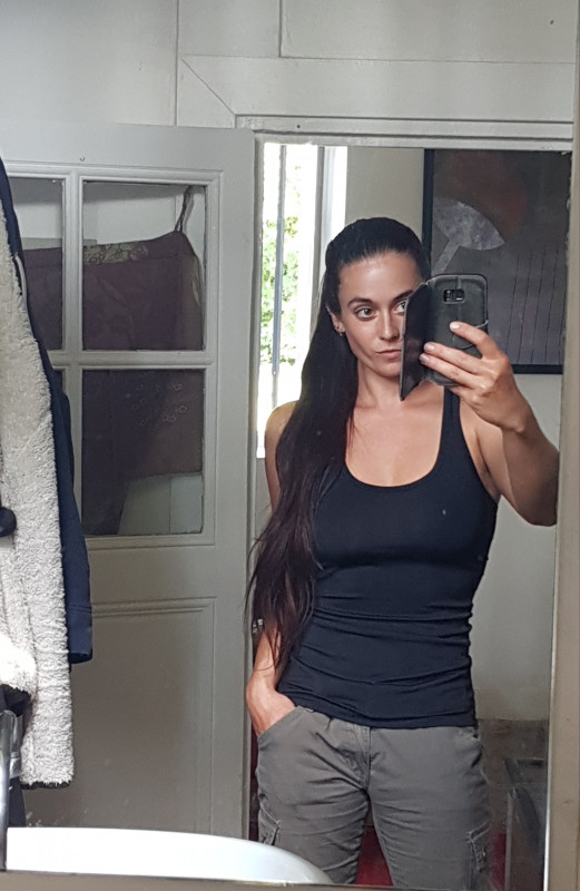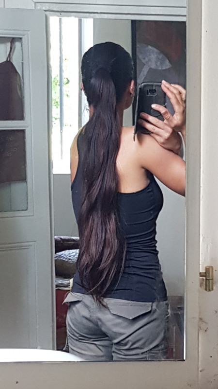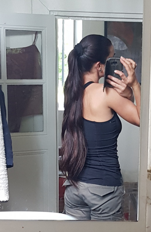 Ici les cheveux vont super bien, j'ai refait un henné il y a 10 jours, ils brillent, ils ont de jolis reflets... Les pointes sont sèches et un peu abîmées, je les ferai couper dans le mois.
