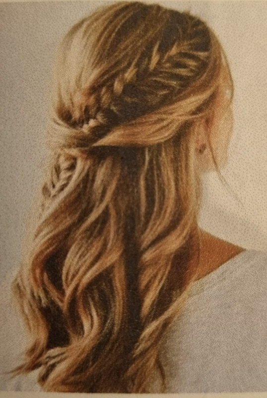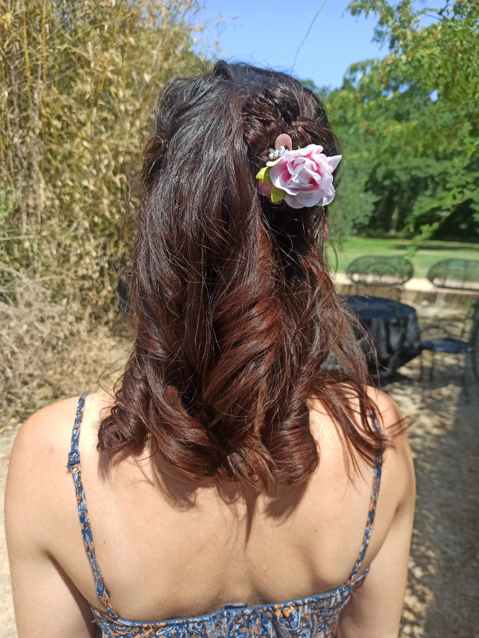 Qu'elle devait adapter à nos 4 longueurs et natures de cheveux différentes. Elles étaient 2 à coiffer, la mienne m'a foirée, n'a pas mis de laquelle: 2h après, plus une boucle. Et pendant le repas, j'ai perdu des épingles à chignon... Dans le truc, j'ai payé, en plus... Avec du recul, je regrette grave!
