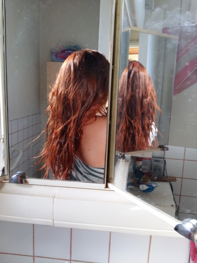 Retour de plage, j'avais juste mit un peu d'huile de coco sur les pointes avant. Rincé à l'eau froide et pas coiffés ^^