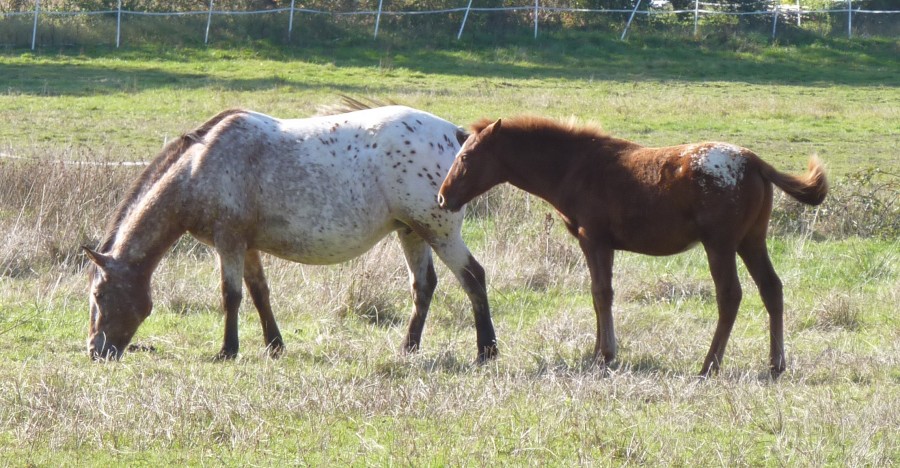 Parents: Cheyenne (Appaloosa - ONC ) et Carbone de la Caboterie, alias Chaman (Paint Horse x Pinto - ONC)