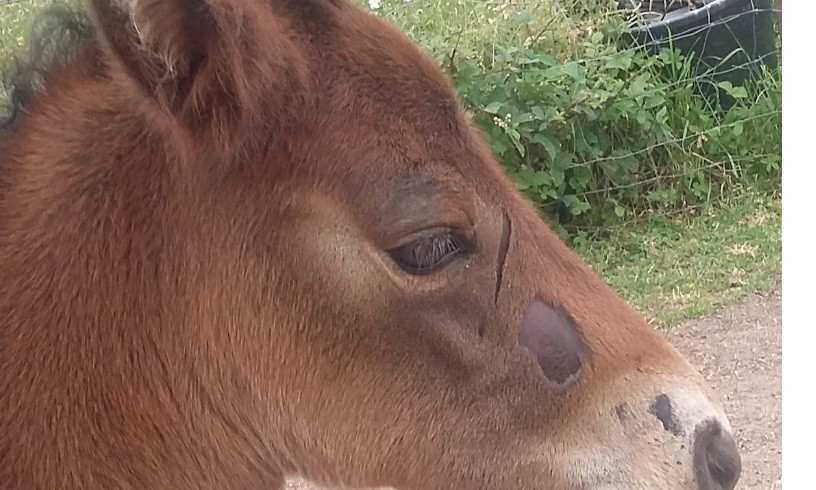 La pouliche n'a apparemment pas de poils gris ou clairs autour des yeux (les fameuses "lunettes"), le bas des jambes est clair et les sabots sont blancs (ils fonceront après).