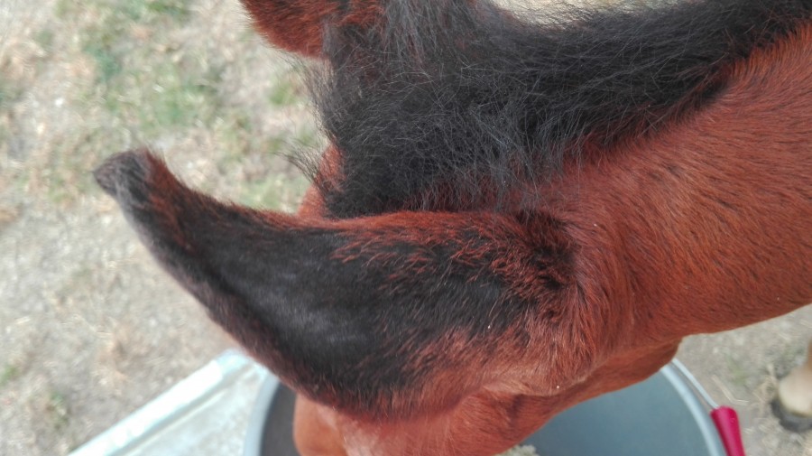 vivi03 Gaïna fait pareil, ses fesses ont déjà le nouveau poil et il est bien bai Mais les oreilles sont noires.