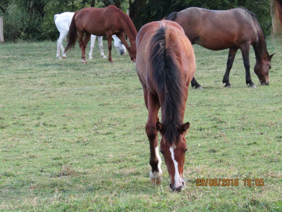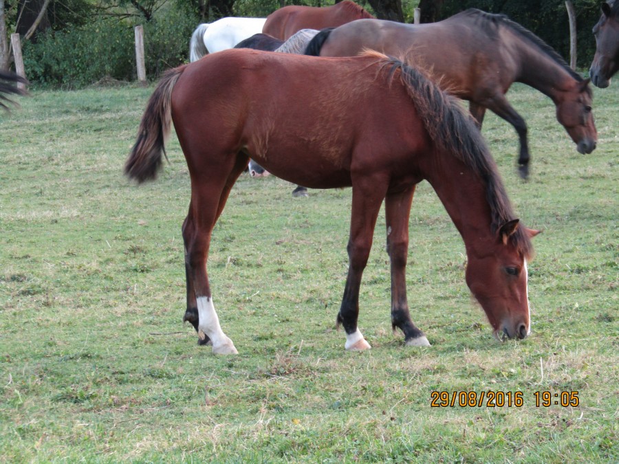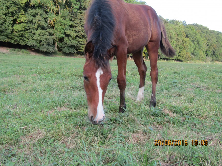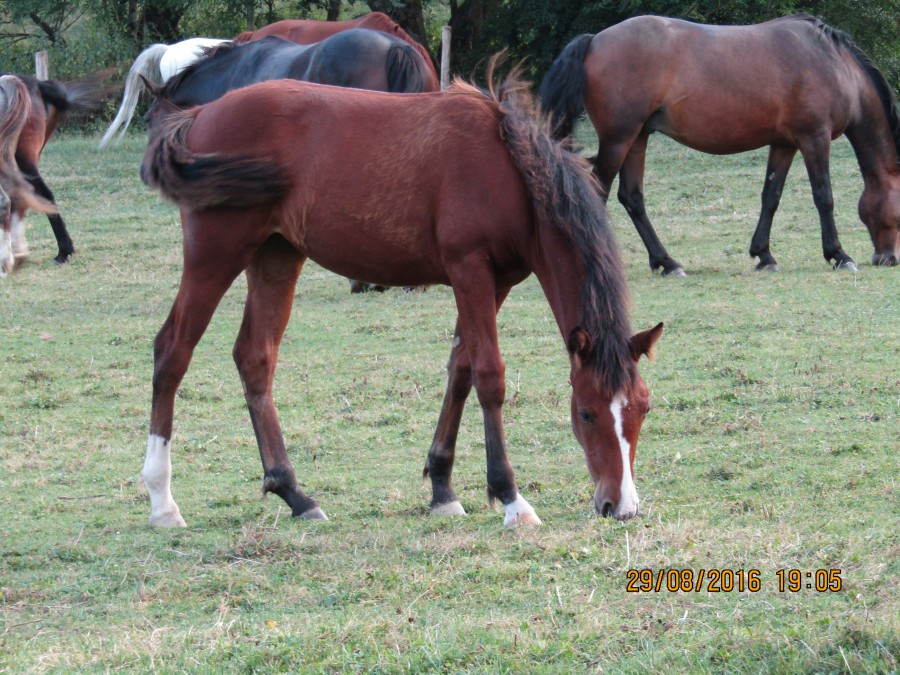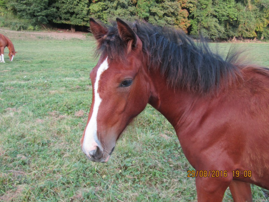 iroise77 la mienne aussi est d'en bai qui va évoluer je pense. des oreilles noires, une tête foncée sur le chanfrein et plus clair pour le reste comme si le foncé était une liste... pas sur d'être très clair...