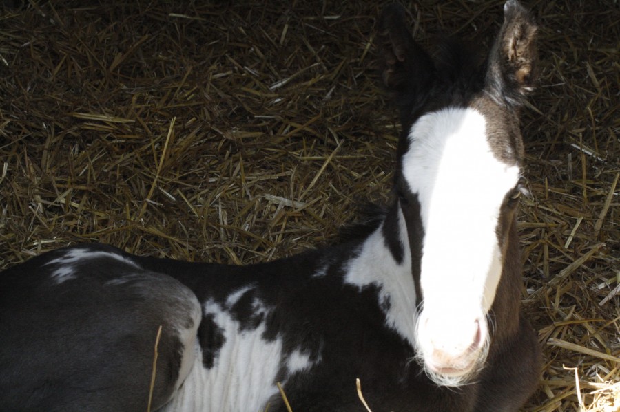 Ce petit bout est née pie gris overo et est maintenant pie overo noir pangaré.
