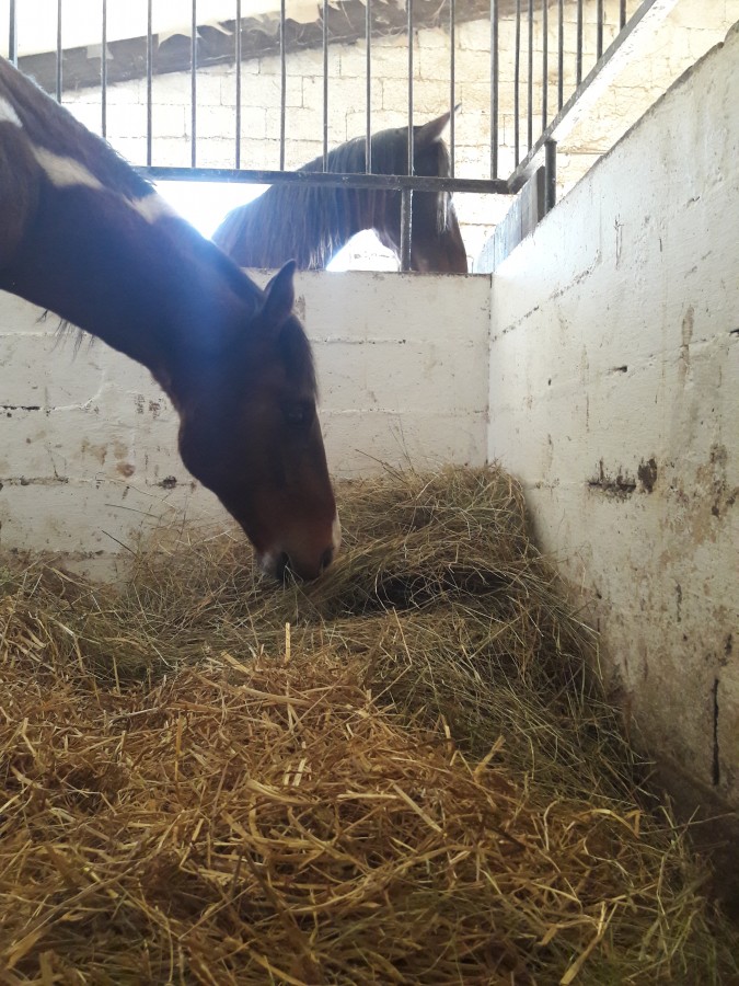 Puis on va grignoter dans le box en découvrant les voisins. ( il n'est resté qu'une semaine au box, le temps que les pâtures sèchent et soient prêtes à accueillir les loulous.)