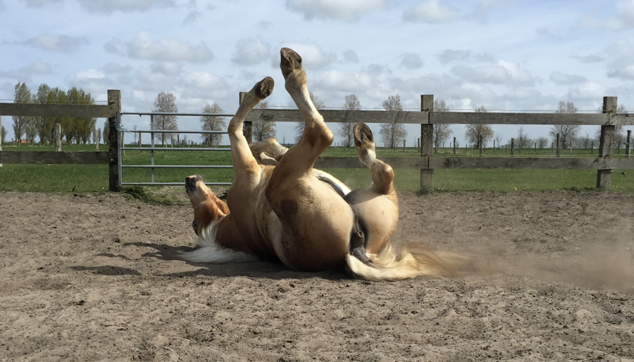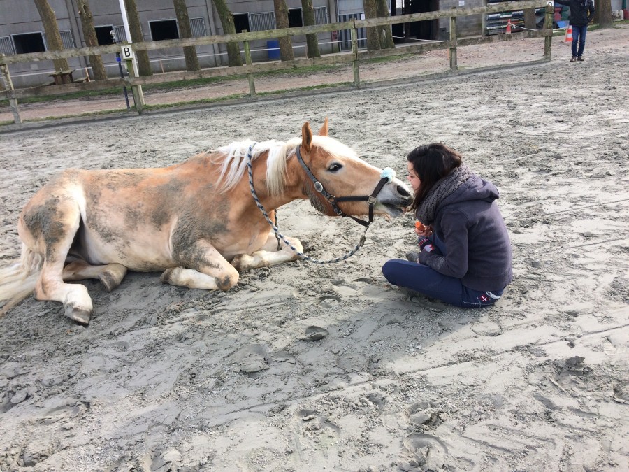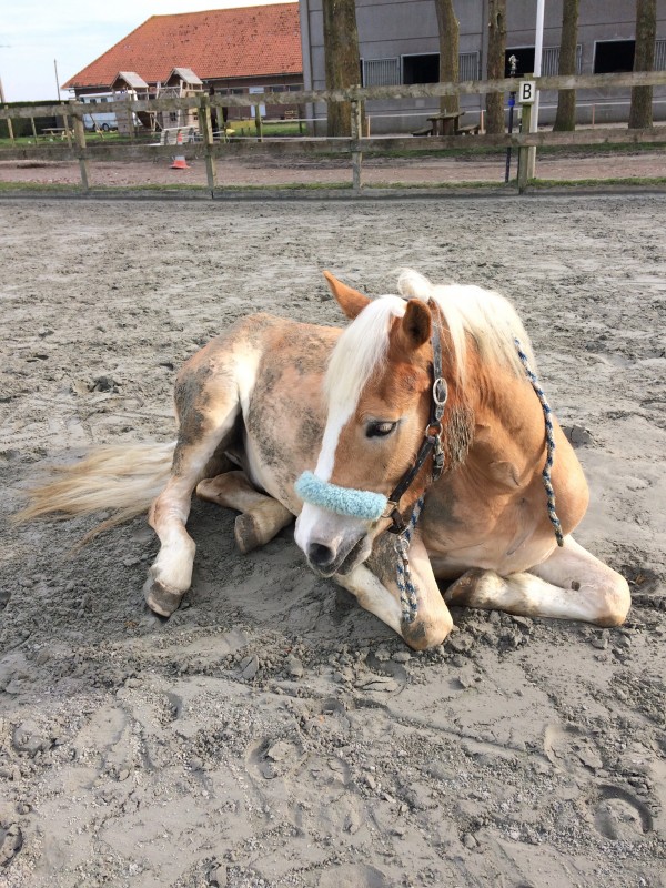 Aussi, il commence vraiment à accepte que je reste près de lui quand il est couché, à défaut de savoir lui apprendre à le faire à la demande, je l'habitue à rester couché après qu'il se soit roulé, étant donné qu'il adore se rouler j'en profite