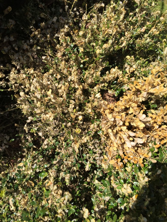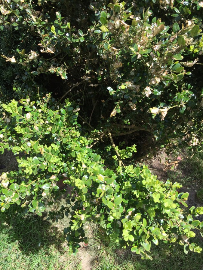Je vous mets des photos. Mais il est vraiment grillé, je ne pense pas qu'il ait gelé. Par contre c'est possible qu'il fasse une overdose de pipi de chiens parce qu'il sert de pissottière et que ça continuera. Ou alors il a une maladie ?